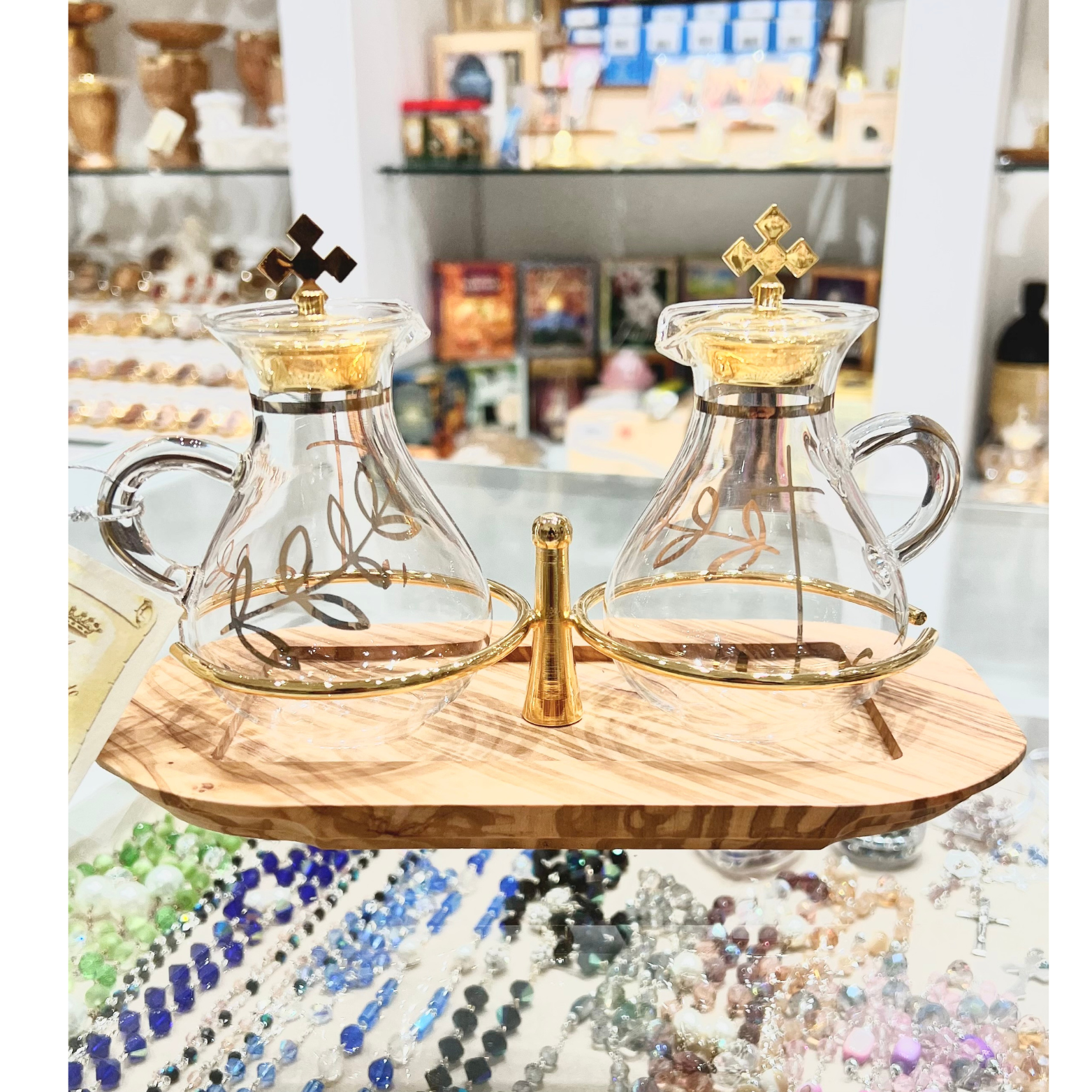Ampolle in vetro soffiato con decorazioni in bagno d'oro, vassoio in legno di ulivo interamente lavorato a mano