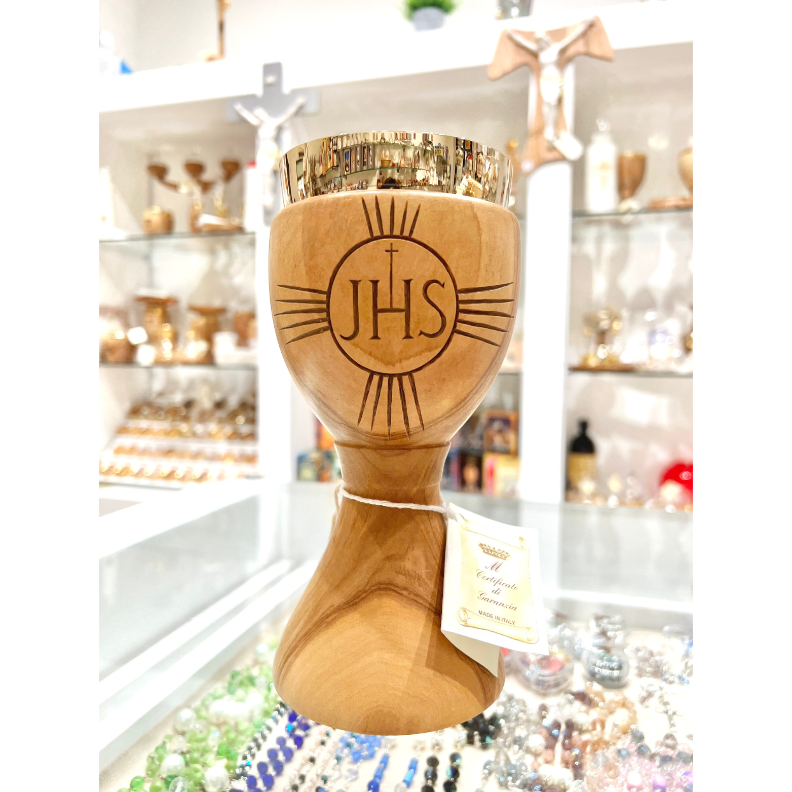 Calice realizzato attraverso tornitura del legno di ulivo , coppa assemblata tramite perno garantendo così la possibilità di essere sostituita o restaurata in qualsiasi momento