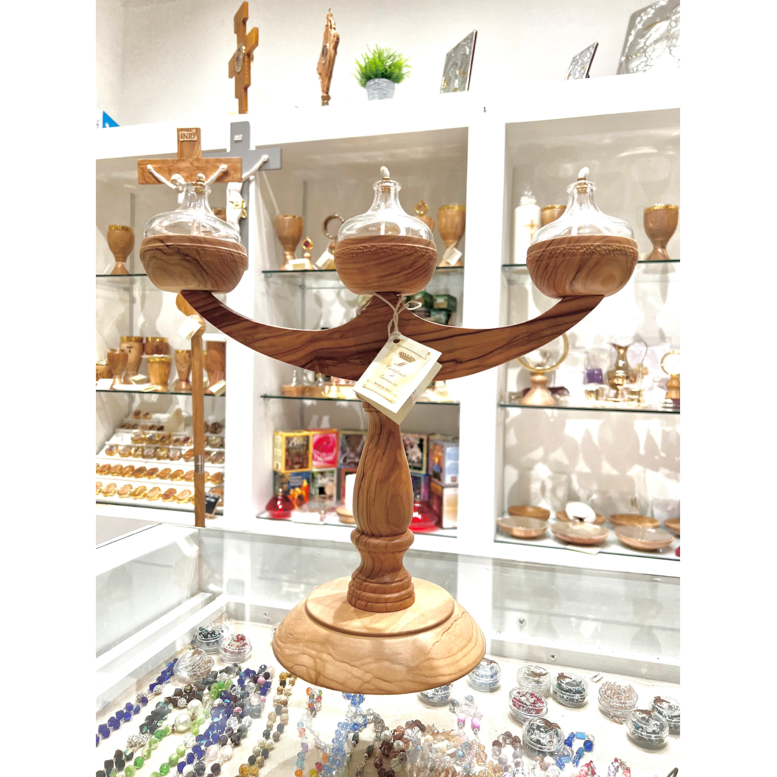 Candelabro a tre fiamme in legno di ulivo interamente lavorato a mano, altezza 37 cm , 3 ampolle per cera liquida diametro 7 cm capacità 80ml, articolo martellato a mano sul lato frontale e liscio nel retro