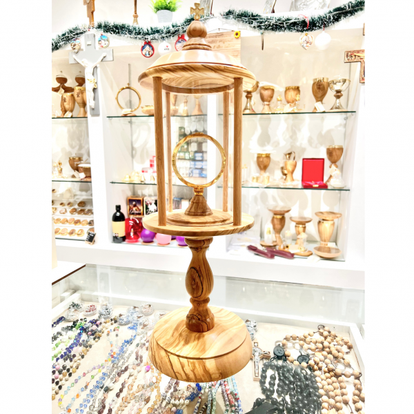Ostensorio Ambrosiano in legno di ulivo interamente lavorato a mano, altezza 55 cm , teca di ottone in bagno d'oro diametro 9 cm, cilindro in plexiglass diametro 12 cm, colonnine in legno