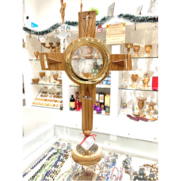 Ostensorio in legno di ulivo interamente lavorato e scolpito a mano, altezza 65 cm , teca di ottone in bagno d'oro diametro 16 cm, base di metallo in bagno d'argento martellata, inserti in legno di mogano