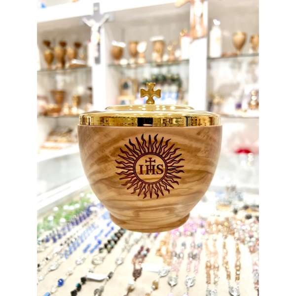 Pisside in legno di ulivo interamente lavorata e incisa a mano, altezza 12 cm , coppa di ottone in bagno d'oro diametro 12 cm
